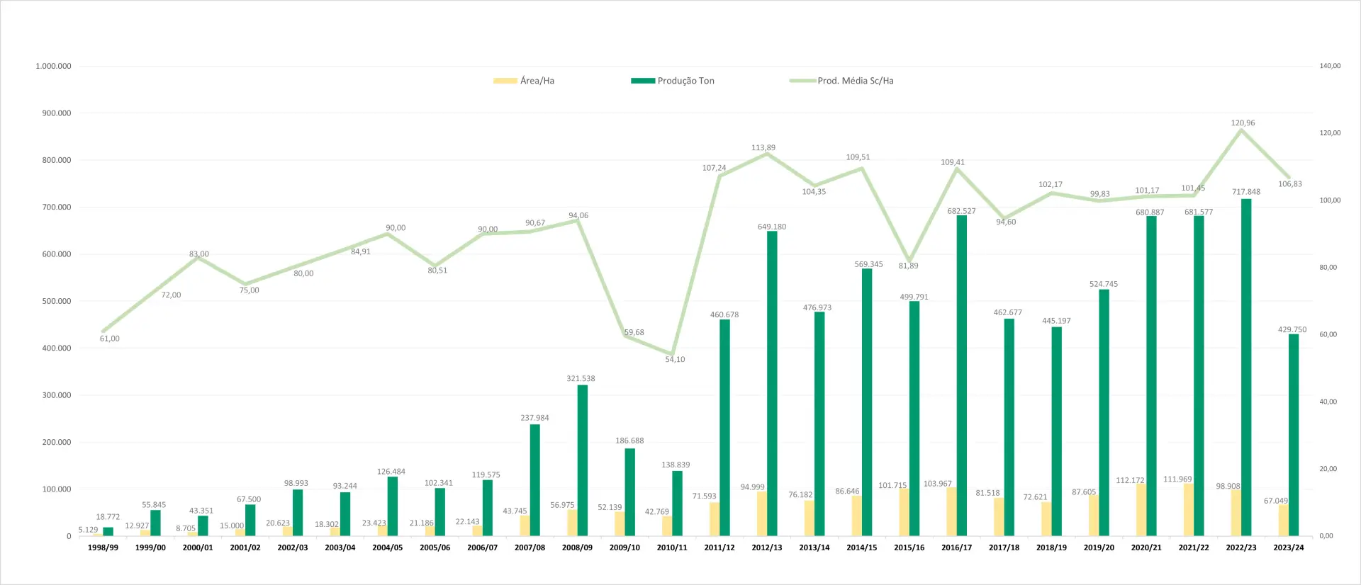 Na companhia, o milho ocupa uma área de aproximadamente 70 mil hectares de cultivo, com média de produtividade entre 90 a 110 sacas por hectare, perfazendo um volume anual de aproximadamente 430 mil toneladas.